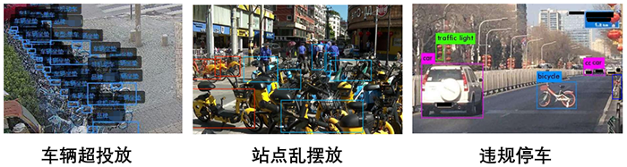 內(nèi)置AI算法的感知設(shè)備采集現(xiàn)場視頻數(shù)據(jù),通過算法檢測超量投放、違規(guī)停放的(電)單車,識別其品牌、車型、投/停放數(shù)量,并形成預(yù)警事件;