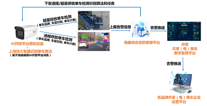 為積極響應(yīng)國家對交通運輸體系發(fā)展的規(guī)劃要求,以及城市監(jiān)管部門對共享兩輪出行企業(yè)管理的實際需要,上海迅久智通網(wǎng)絡(luò)科技有限公司借助海康威視AI開放平臺訓練(電)單車檢測,品牌識別,車型識別,數(shù)量統(tǒng)計算法,一鍵部署到AI開放平臺感知設(shè)備上,能夠?qū)崟r、高效地對城市道路(電)單車投/停放亂像進行預(yù)警。同時,公司采用“AI+視頻”技術(shù),為城市監(jiān)管部門及共享(電)單車企業(yè)提供了全系統(tǒng)、全流程的智慧管理服務(wù)平臺。