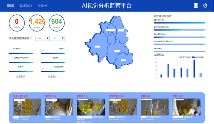 AI視覺分析監(jiān)管平臺直觀展現(xiàn)預(yù)警大數(shù)據(jù)分析結(jié)果,監(jiān)管部門經(jīng)過接收醫(yī)療機(jī)構(gòu)預(yù)警處理狀況,整體把握區(qū)域內(nèi)的辦理狀況,全面強(qiáng)化了衛(wèi)生健康綜合執(zhí)法監(jiān)管力度。